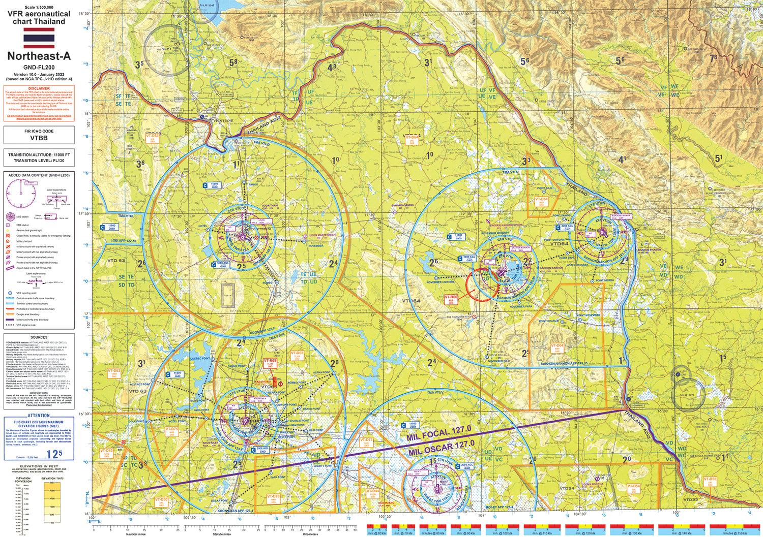 The Thailand Visual Flight Rules (VFR) Charts are carefully created by our partner, Thailand VFR Charts. There are six different charts (scale 1:500.000) of two different sizes (DIN-A1 and DIN-B0), that cover almost the whole Kingdom of Thailand. The charts are based on the NGA Tactical Pilotage Charts (TPC), AIP Thailand and many other sources, but are not official or government-endorsed. They are completely true to scale.