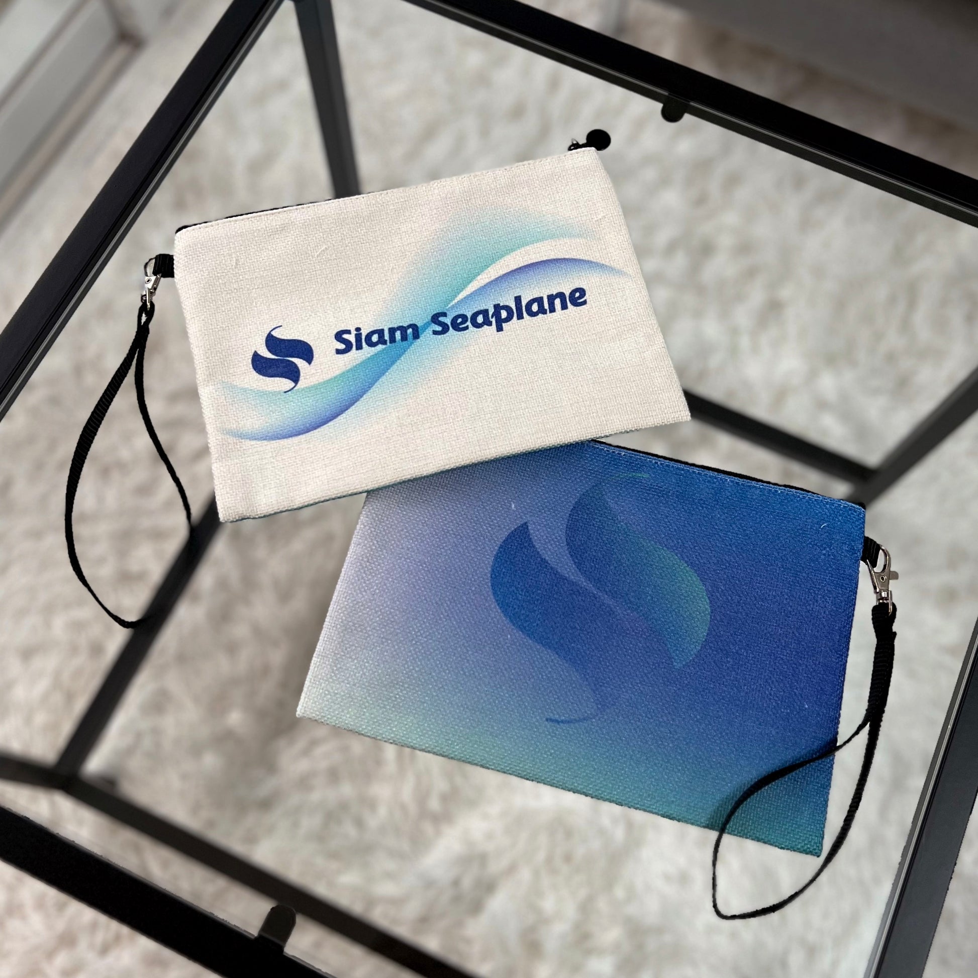 Introducing our woven linen pochette featuring graphic branding visuals on both sides. The same bag used for our amenity kit only available on our aircraft. Designed with your convenience in mind, the bag is spacious enough to accommodate all your travel essentials. The zippered closure keeps your belongings secure, while the compact size makes it easy to stow.